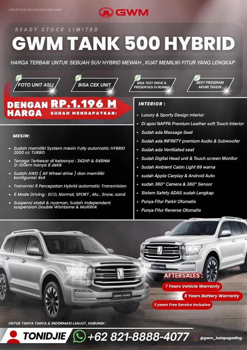 Liputan6.com, Jakarta - Great Wall Motor (GWM) resmi memperkenalkan Tank 500 model 2026, SUV bongsor yang kini hadir dengan teknologi elektrifikasi terbaru. Tidak hanya bertenaga besar, Tank 500 juga dibekali fitur canggih, termasuk night vision untuk keamanan...